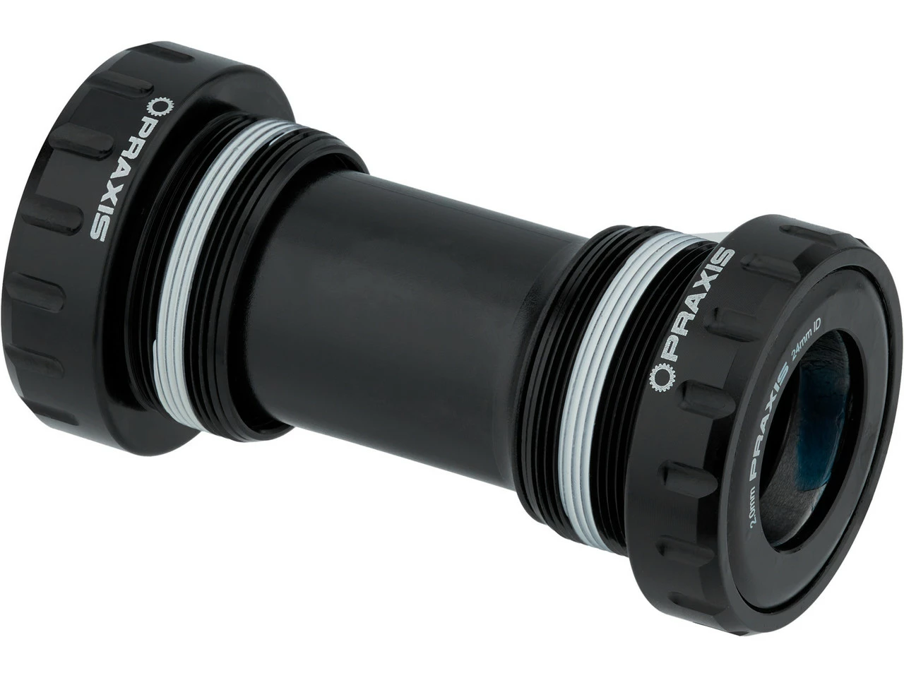 Mit dem Praxis Works M24 Innenlager kannst Du eine Praxis M24, Oval Concepts M24 oder SRAM GXP Kurbel mit Stahlachse in einen BSA 68/73 mm Road- oder MTB-Rahmen einbauen. Auf der Antriebsseite findet sich ein 24 mm Lager, auf der Nicht-Antriebsseite ein 22 mm Lager. Es handelt sich um Industrielager aus Stahl.
