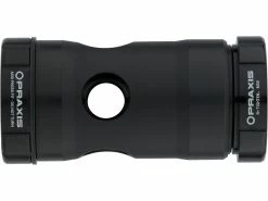 Mit dieser patentierten Praxis Works Technologie werden nicht nur alle Toleranzen der Rahmenhersteller neutralisiert, sondern es wird auch eine erhöhte Lebensdauer gewährleistet. Bei Praxis Collet Innenlagern wird die Nicht-Antriebseite eingepresst und dann die Antriebseite darin verschraubt. Beim Verschrauben spreizt sich das Lager bis zu einer definierten Endposition, welches dem jeweiligen Pressfit entspricht, und sitzt fest, ohne Geräusche zu machen. Außerdem wird in Antriebsrichtung ein oranger Elastomer-Gummiring komprimiert, der sich dann wiederum zum Rahmen hin ausdehnt und das Lager dadurch noch einmal zusätzlich verklemmt. Das Elastomer-Material gleicht Toleranzen aus und puffert zugleich eventuelle Knackgeräusche weg.