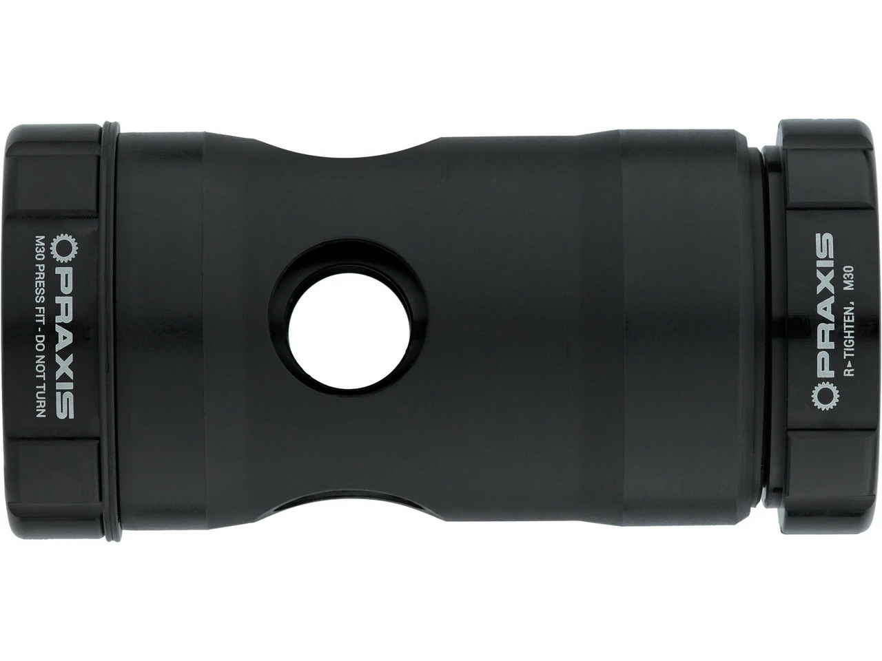 Praxis Works M30 Innenlager sind ausschließlich zur Verwendung mit Praxis Works M30 Kurbeln geeignet. Die M30 Achse entspricht einer Art “ Oversize GXP“ . Sie ist 30 mm dick und am linken Ende auf 28 mm reduziert, um auf das nicht-antriebsseitige Lager zu passen. Zum Einsatz kommen eine wellenförmige Unterlegscheibe auf der Antriebsseite zur Vorspannung sowie ein 30 mm Lager, dem auf der Nichtantriebsseite ein 28 mm Lager gegenübersteht. M30 kombiniert die Vorteile breiter Lager mit den Vorteilen einer stämmigen 30 mm Achse. Dies ermöglicht einen sicheren Sitz und bessere Kraftübertragung.