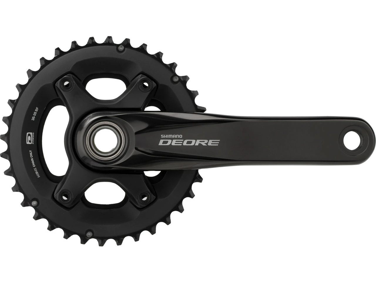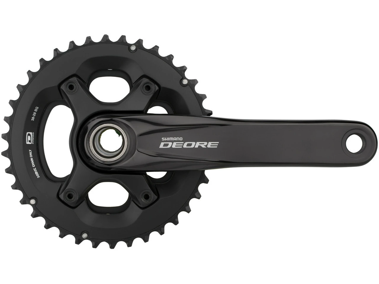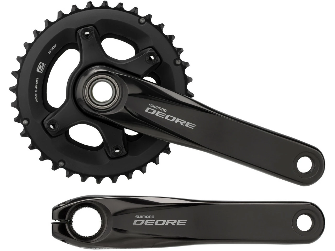 Bei der Shimano Deore FC-M6000-2 Kurbelgarnitur kommt erstmals auf Deore Niveau das Hollowtech II Konzept zum Einsatz, das für ein optimales Verhältnis zwischen der Festigkeit der Kurbelarme, der Steifigkeit der Achse und dem Gewicht sorgt. Die Aluminium-Kurbel ist gegenüber dem Vorgängermodell schlanker geworden und erinnert optisch an die ein Jahr zuvor vorgestellte SLX FC-M7000. Deore FC-M6000-2 ist aber weiterhin mit 10-fach Schaltungen kompatibel. Die zwei Kettenblätter sitzen an einem asymmetrischen Spider mit 96/64 mm Lochkreis, der wiederum von den Kurbeln aus den teureren Gruppen übernommen wurde. So präsentiert sich die Allround-Kurbel Deore wie eh und je als solide Wahl für alle MTB-Spielarten von Cross Country bis All Mountain.