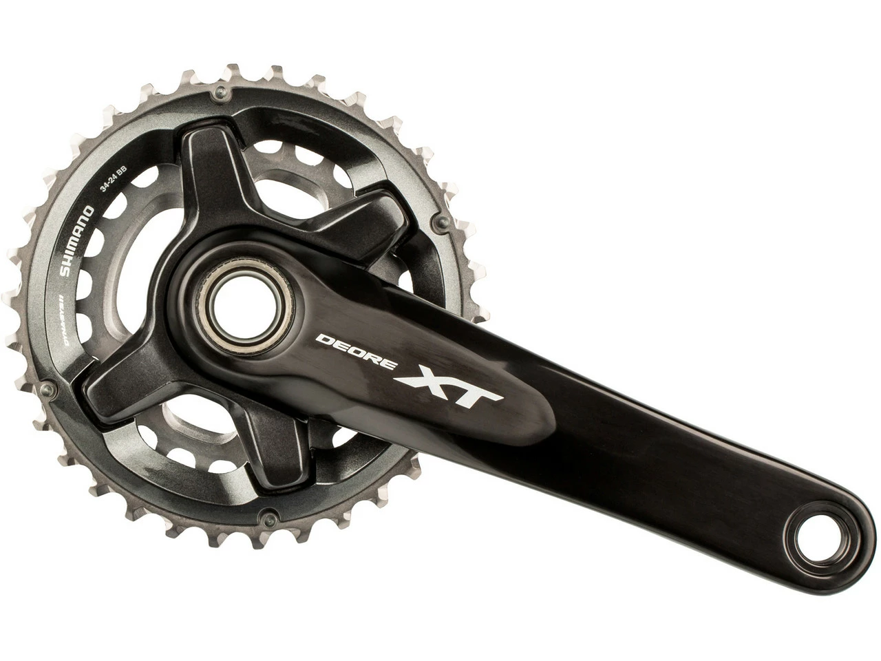 Die Shimano XT FC-M8000-2 Kurbelgarnitur mit der Abstufung 24-34, 26-36 oder 28-38 Zähne zeichnet sich durch besondere Antriebseffizienz und wettkampftaugliche Performance aus. Es handelt sich um eine von drei Kurbeloptionen im XT 11-fach Schaltsystem, das nach dem „Rider Tuned“ Prinzip fĂĽr jeden Fahrertyp und jedes Gelände das passende Set-up zur VerfĂĽgung stellt. Die FC-M8000-2 Aluminium-Kurbel ĂĽberzeugt durch präzises Schalten sowie durch Robustheit und geringes Gewicht. Sie ist im Hinblick auf Ăśbersetzung und gleichmäßigen Tretrhythmus optimal abgestimmt (Dyna-Sys11 Technologie). Das seit vielen Jahren bewährte Hollowtech II Design mit fest verbundener 24 mm Achse sorgt zusätzlich fĂĽr Stabilität.