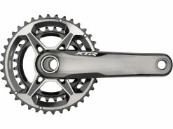 Die Shimano XTR XC FC-M9100-2, die inklusive TL-FC41 Kettenblattwerkzeug ausgeliefert wird, ist eine Kurbelgarnitur für den Cross-Country-Einsatz mit zwei Kettenblättern. Dabei wird das große Kettenblatt nach dem Direct-Mount-Prinzip installiert. FC-M9100-2 hat einen schmaleren, renntauglichen Q-Faktor von 162 mm und ist nur für den Einsatz mit 12-fach Antrieben vorgesehen. Das Modell richtet sich an Fahrer, denen es in unbekanntem Gelände mit möglicherweise steilen Ansteigen auf Flexibilität und eine größtmögliche Bandbreite ankommt. Die Aluminium-Kurbel verfügt natürlich auch über die seit Jahren bewährte Hollowtech-II-Konstruktion, die zwischen der Festigkeit der Kurbelarme, der Steifigkeit der Achse und dem Gewicht ein optimales Verhältnis herstellt.
