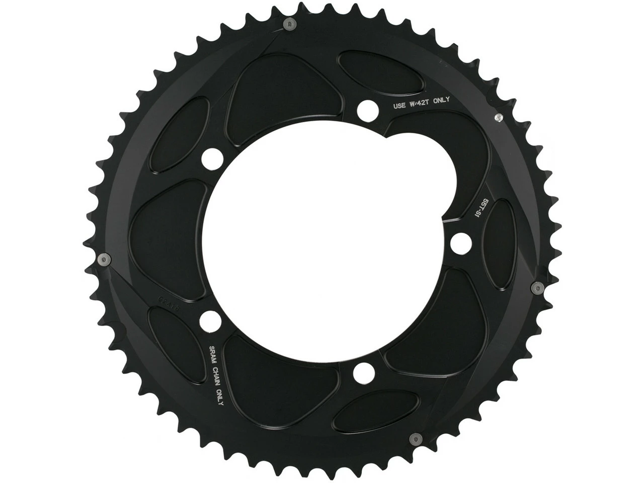 SRAM TT Kettenblätter sind mit 53, 54 und 55 Zähnen und einem entsprechenden Innenblatt mit 42 Zähnen erhältlich. Die PowerGlide™-Kettenblätter wurden in den vergangenen Jahren von den weltbesten Zeitfahrern eingesetzt. Sie sind robust, steif und aerodynamisch und sehen mit der per Laser-Ätzung aufgebrachten SRAM-Grafik gefährlich schnell aus.